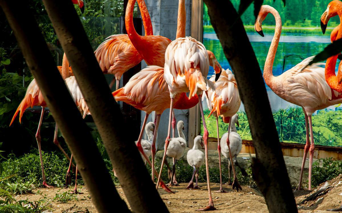 Nearly a month after their birth, four flamingo babies are getting stronger and have welcomed their first visitors at Longsha Zoological and Botanical Garden in Qiqihar, Heilongjiang province.