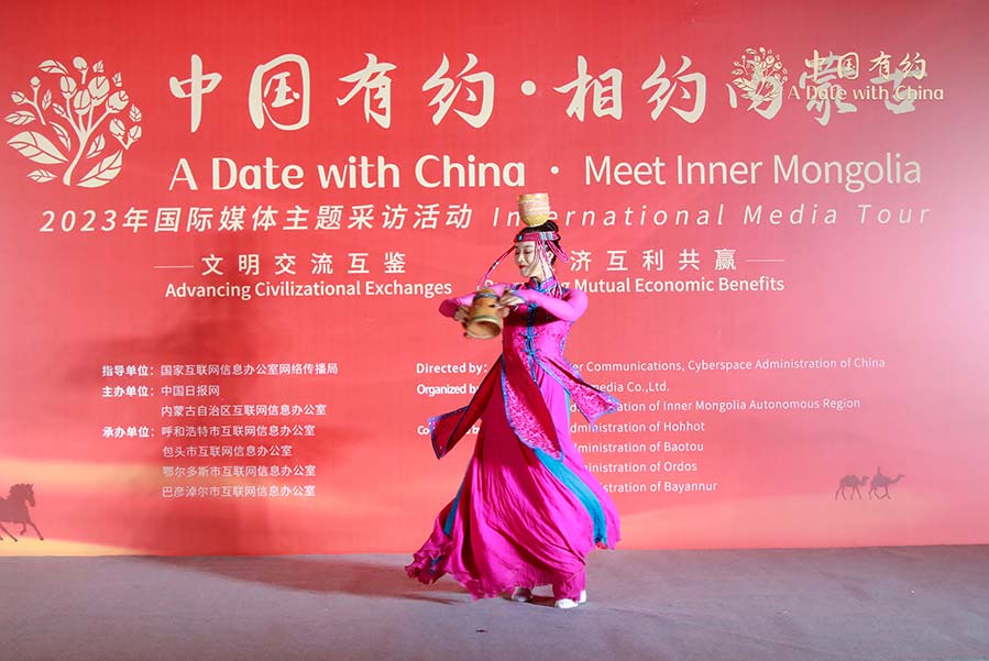A dancer performs at the launching ceremony of the 2023 "A date with China" International media tour in Hohhot of Inner Mongolia autonomous region, July 12, 2023. [Photo/chinadaily.com.cn]