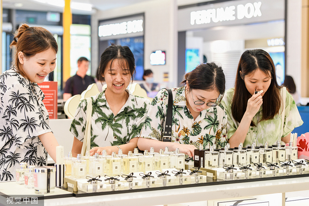 Customers select perfumes at a duty-free shop in Haikou, Hainan province, July 13, 2023. [Photo/VCG]
