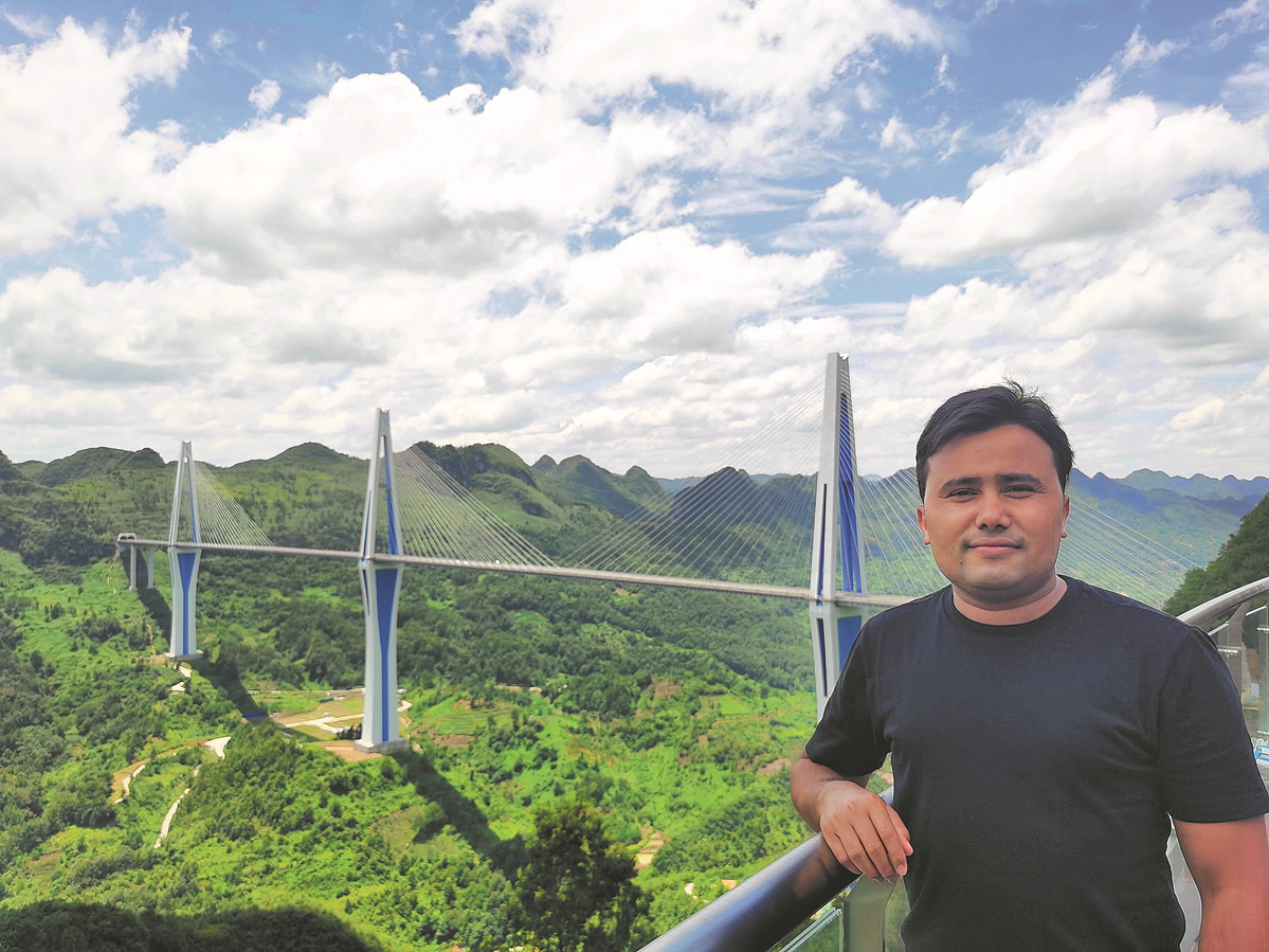 Shatrohan Kumar Das, from Nepal, poses for a photo in front of the Pingtang Bridge in Guizhou province. CHINA DAILY