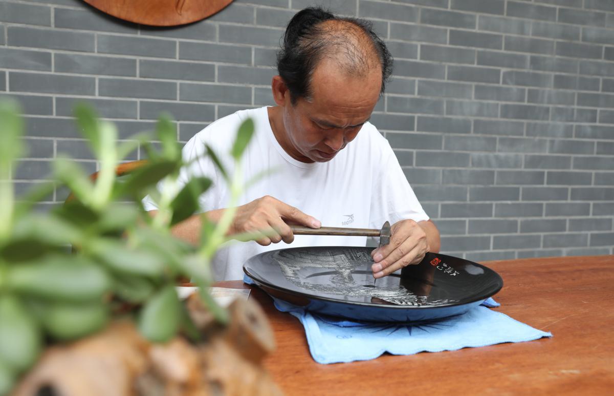 Porcelain carver Hou Hanpeng carves a porcelain artwork. [Photo provided to chinadaily.com.cn]