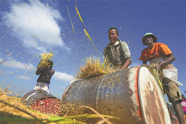 Farmers thresh the hybrid rice on April 26. GU PENGBO/ZHOU YUEGUI/FOR CHINA DAILY