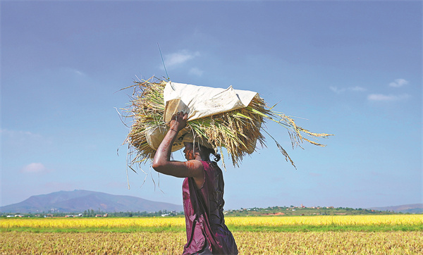 A farmer walks with harvested spikes of rice in the paddy field on April 26. GU PENGBO/ZHOU YUEGUI/FOR CHINA DAILY
