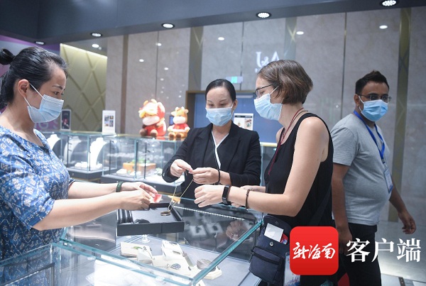 A foreign customer picks up jewelry at HTDF-Sanya. [Photo/Hainan Daily]