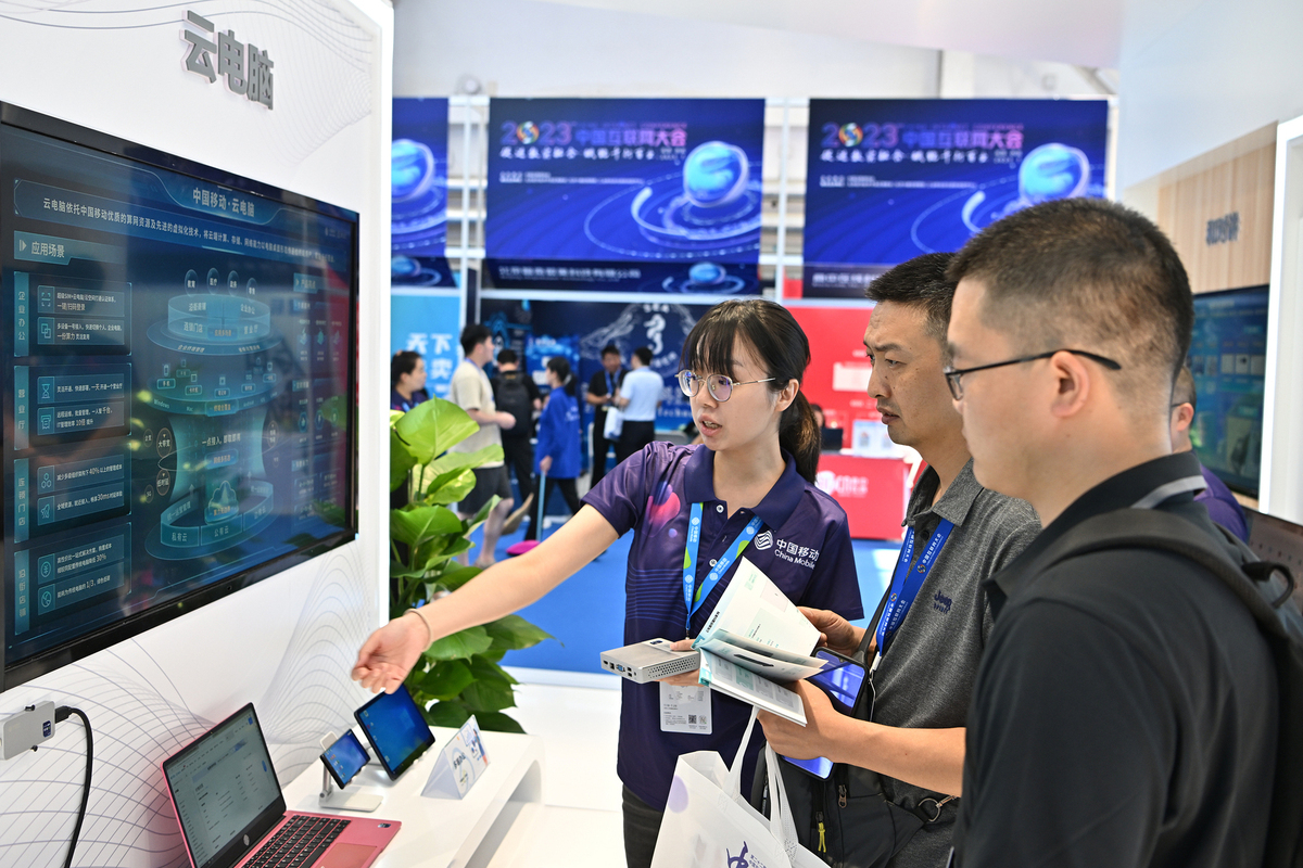 Visitors learn about cloud computer technology at an exhibition on digital technologies at 2023 China Internet Conference in Beijing, July 18, 2023. [Photo/Xinhua]