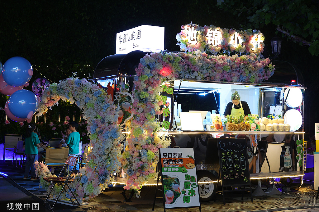 A beverage stand decorated with flowers is seen at a night fair at Gaoxin district, Chongqing, July 15, 2023. [Photo/VCG]