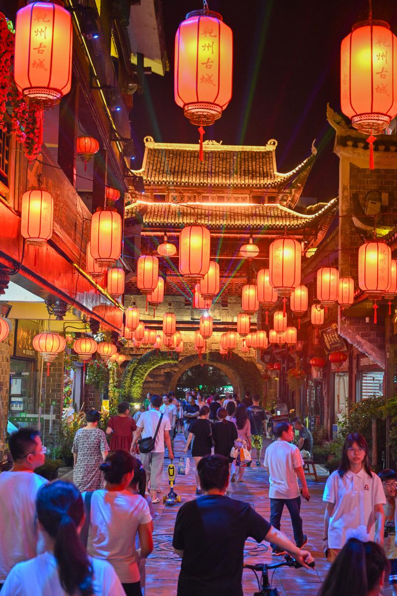 When night falls, many local residents and tourists can be seen gathering under the brilliant lights — to eat, drink, shop, enjoy the night scenes or be entertained in the city's Qianzhou ancient town — while enjoying and sensing the charm of the ancient town.