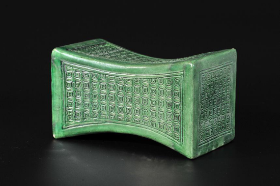 Green-glazed slim waist pillow with interlocking coin patterns, Jin Dynasty, from the collection of the Museum of the Western Han Dynasty Mausoleum of the Nanyue King [Photo/Official WeChat account of the Hebei Museum]
