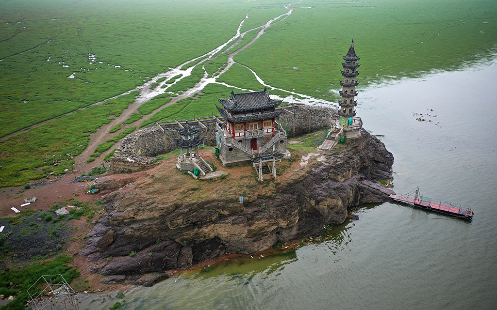 Aerial view of a Zen-style temple surrounded by a pagoda, archways, and pavilions on Poyang Lake in Jiangxi province [Photo/IC]