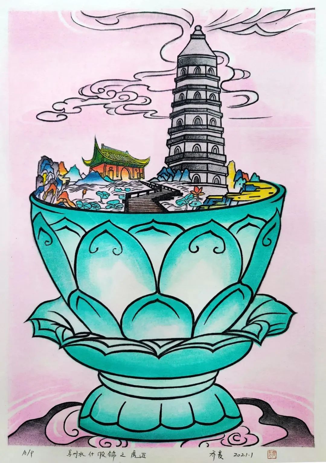 A Suzhou print depicting the Tiger Hill Pagoda by Chinese artist Qiao Lanrong, 2021, [Photo/Official WeChat account of the Museum of Wu]