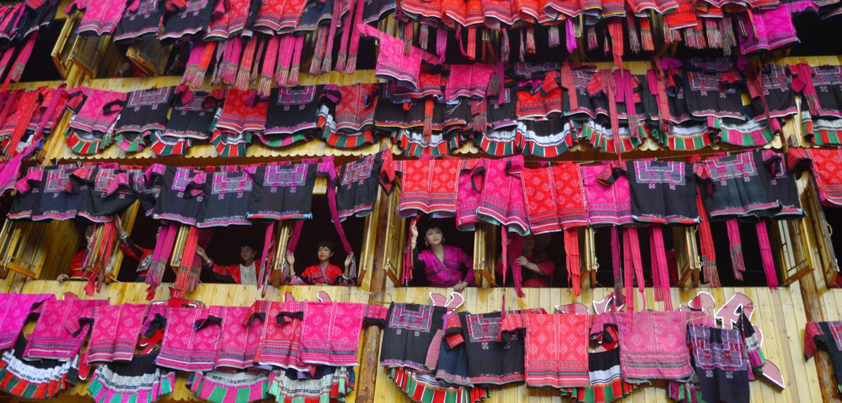 Women of the Red Yao ethnic group hang their traditional colorful clothes in the sun in Longsheng county, Guangxi Zhuang autonomous region, on Sunday. [Photo by Pan Zhixiang for chinadaily.com.cn]