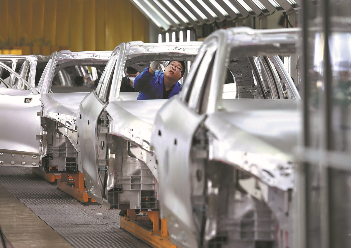Employees work on a production line of new energy vehicles at NIO's plant in Hefei, Anhui province, in August 2022. [XIE CHEN/FOR CHINA DAILY]