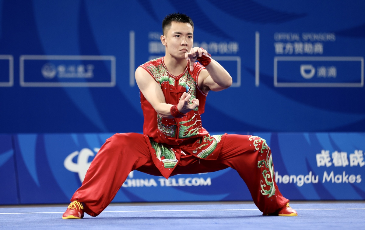 Dressed in a red outfit embroidered with green dragons, Chinese wushu athlete Cao Maoyuan realized his dream of becoming an international champion by collecting two titles at the Chengdu FISU World University Games.