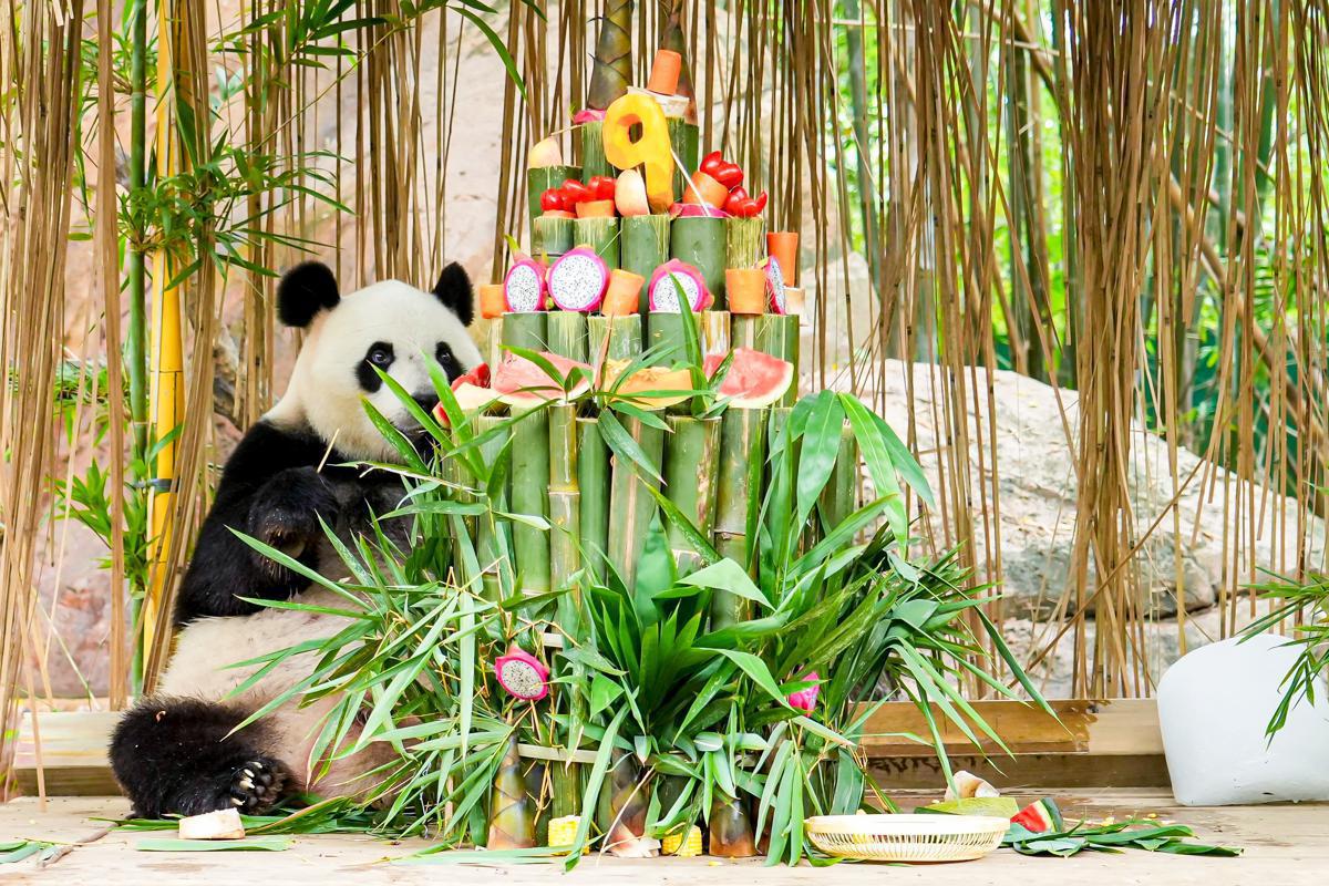 The world's only giant panda triplets - Meng Meng, Shuaishuai and Kuku - celebrated their ninth birthday at the Guangzhou Chimelong Safari Park. [Photo provided to chinadaily.com.cn]