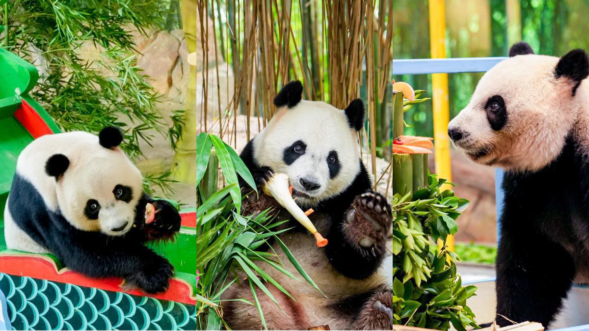 The world's only giant panda triplets - Meng Meng, Shuaishuai and Kuku - celebrated their ninth birthday at the Guangzhou Chimelong Safari Park. [Photo provided to chinadaily.com.cn]