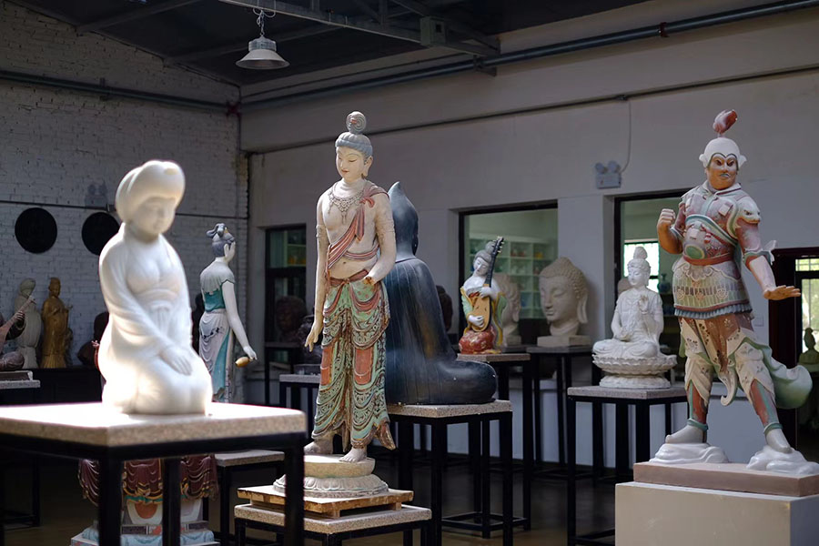 Buddhist statues are on display at Mogaoli Craftsman Village in Dunhuang, Northwest China's Gansu province on July 29, 2023. [Photo by Yang Xiaoyu/chinadaily.com.cn]
