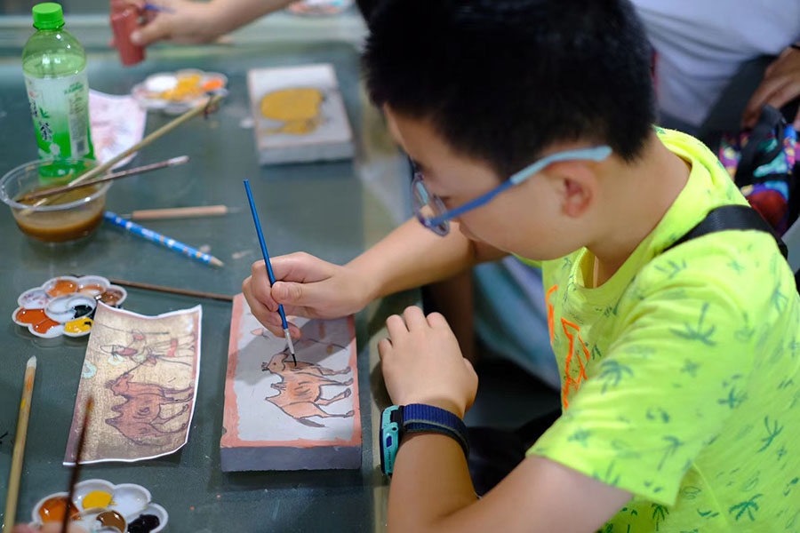 A boy makes a portrait brick replica at Mogaoli Craftsman Village in Dunhuang, Northwest China's Gansu province on July 29, 2023. [Photo by Yang Xiaoyu/chinadaily.com.cn]