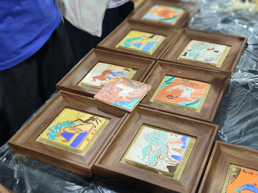 Tourists wait to have their clay murals mounted at Mogaoli Craftsman Village in Dunhuang, Northwest China's Gansu province on July 29, 2023. [Photo by Yang Xiaoyu/chinadaily.com.cn]