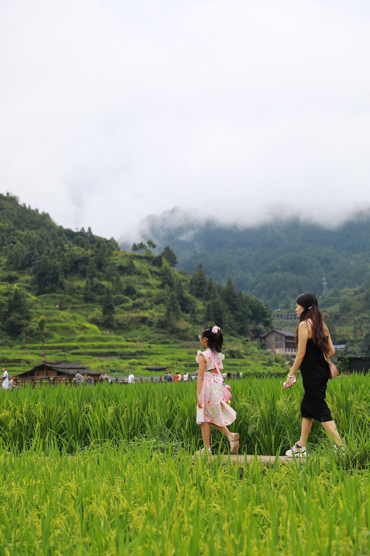 Tourists walk among the rice paddies in Xijiang Qianhu Miao village in Leishan county of Southwest China's Guizhou province. [Photo by Wu Xianyan/provided to chinadaily.com.cn]