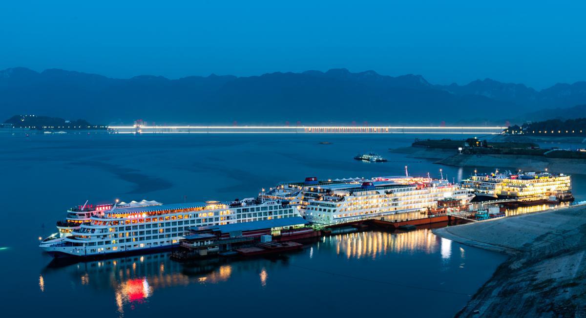 Cruise ships are docked at Zigui port in Yichang, Hubei province. The port is equipped with shore power facilities, and can charge 12 cruise ships simultaneously. [Photo provided to chinadaily.com.cn]