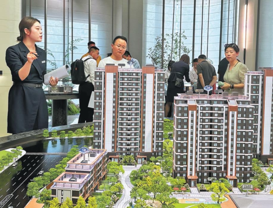 Potential homebuyers look at a property model in Beijing. JIANG QIMING/CHINA NEWS SERVICE