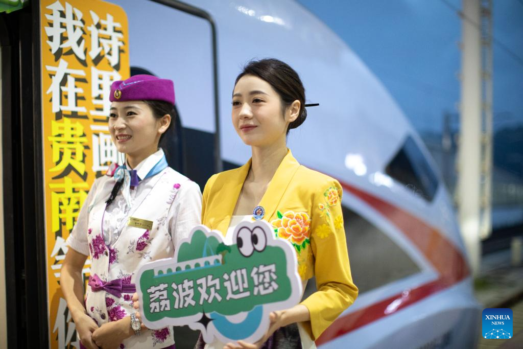 Conductors of Train D6171 welcome passengers at Guiyang North Railway Station in Guiyang, Southwest China's Guizhou province, on Aug 8, 2023. [Photo/Xinhua]