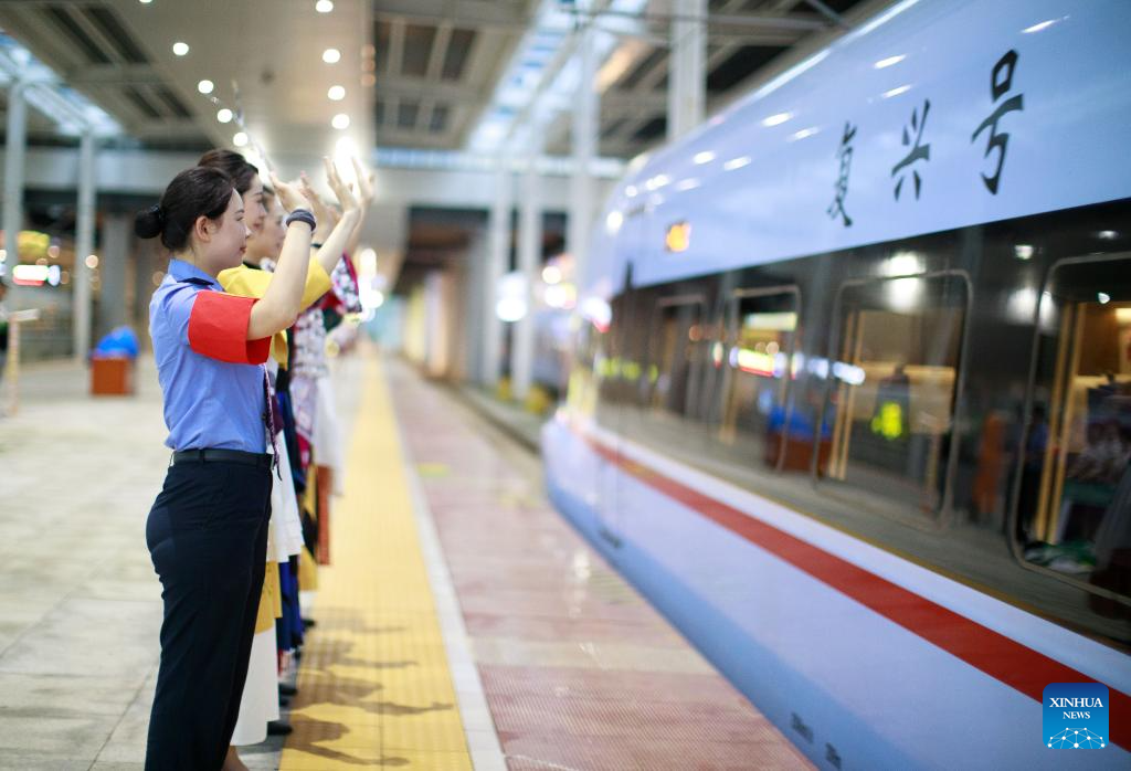 Staff members wave goodbye to passengers aborad Train D6171 at Guiyang North Railway Station in Guiyang, Southwest China's Guizhou province, on Aug 8, 2023. [Photo/Xinhua]