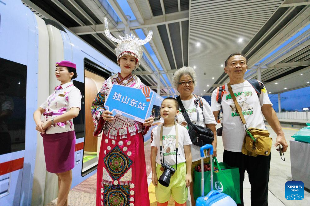 Passengers pose for photos with a conductor in traditional ethnic attire at Guiyang North Railway Station in Guiyang, Southwest China's Guizhou province, on Aug 8, 2023. [Photo/Xinhua]