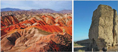 Zhangye's Danxia landform, formed more than 2 million years ago, is 35 kilometers south of the city and covers an area of about 40 square km. The term Danxia landform refers to the ranges of red glutenite mountains developed through centuries of weathering and erosion by wind and water.
