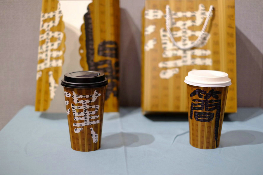 Jiandu-inspired takeout coffee cups are on display at the Museum of Northwest Normal University in Lanzhou, capital of Northwest China’s Gansu province on July 31, 2023. [Photo by Yang Xiaoyu/chinadaily.com.cn]