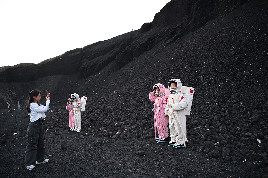 Visitors wearing space suits pose for photos at Wulanhada Volcano Geopark in Inner Mongolia autonomous region. [Photo/IC]