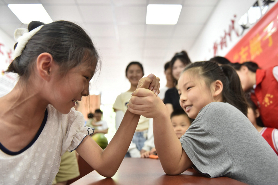 A photo taken on August 9, 2023 shows residents taking part in a series of fun contests held by a local community in Hefei, Anhui province. [Photo/CGTN]