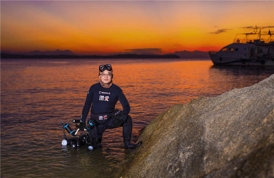 Photographer Yue Hongjun in a diving suit [Photo by Yue Hongjun/cpanet.org.cn]