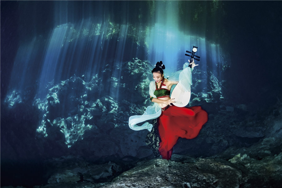 The photo shows a Dunhuang dance in a deep sea cave. [Photo by Yue Hongjun/cpanet.org.cn]