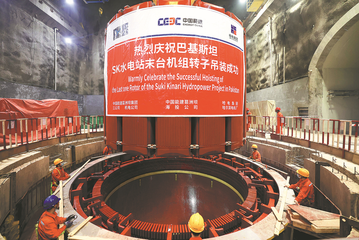 The last rotor of a hydropower unit constructed by China Gezhouba Group Co Ltd is hoisted in Pakistan in June. [Photo/Xinhua]