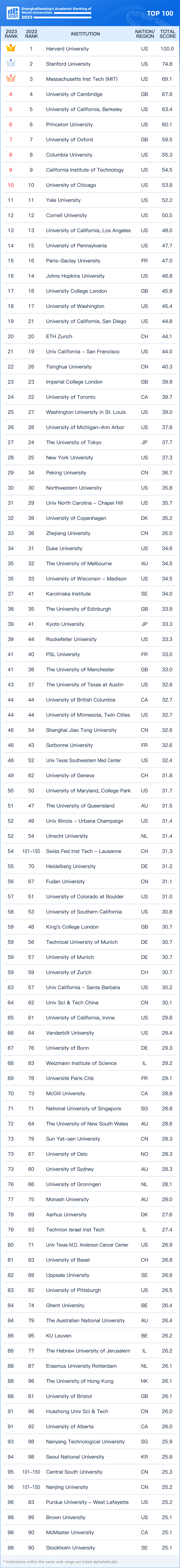 The 2023 Academic Ranking of World Universities (ARWU) was released on Tuesday by Shanghai Ranking Consultancy.