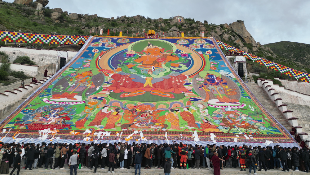 People visit a giant thangka marking the start of the annual Shoton Festival on Wednesday in Lhasa. [Photo by Wangchuk Tsering/chinadaily.com.cn]