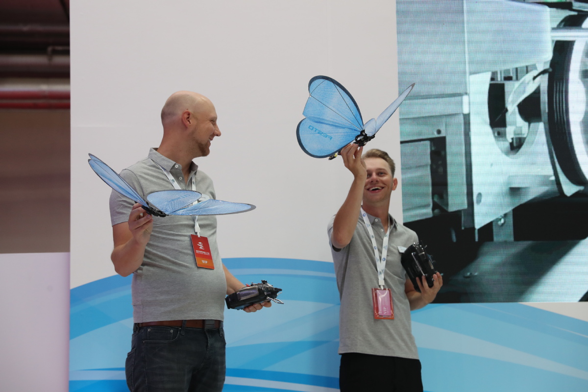 Staff members demonstrate the bionic butterflies at the Festo booth at the World Robot Conference 2023 in Beijing on Aug 16, 2023. [Photo by Wang Jing/chinadaily.com.cn]
