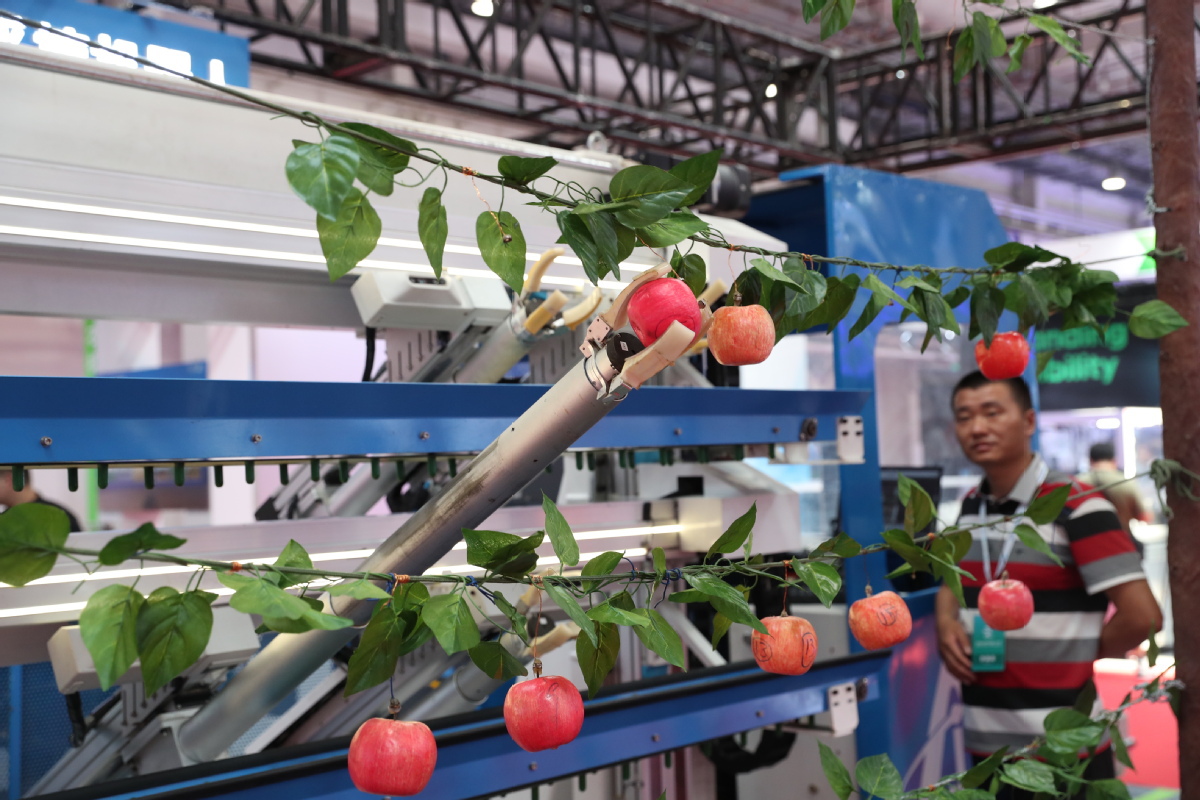 An agricultural robotic arm picks apples at the World Robot Conference 2023 in Beijing on Aug 16, 2023. [Photo by Wang Jing/chinadaily.com.cn]