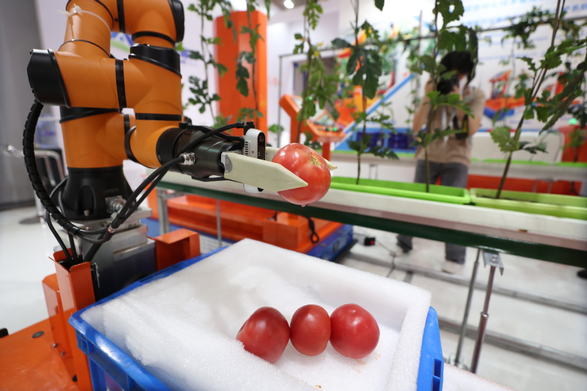 An agricultural robotic arm picks up tomatoes at the World Robot Conference 2023 in Beijing on Aug 16, 2023. [Photo by Wang Jing/chinadaily.com.cn]