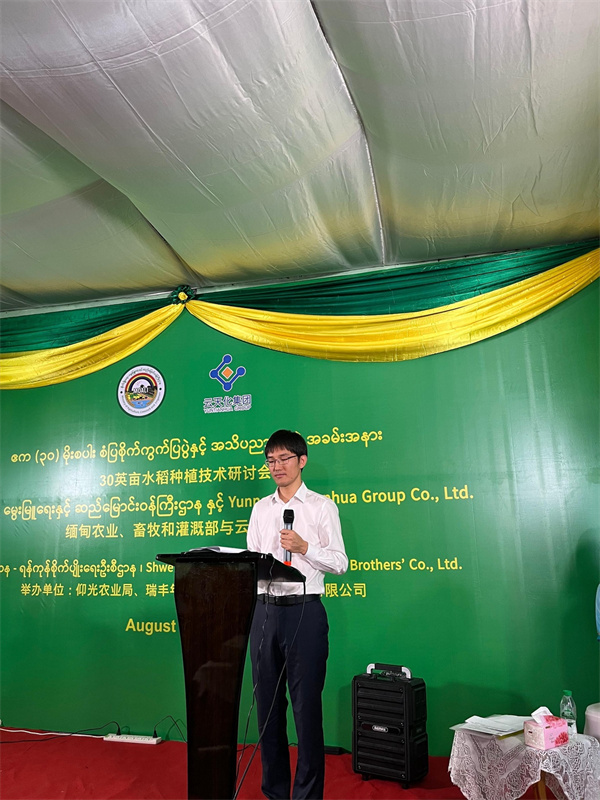 A seminar on rice planting cultivation techniques is held at a farm in Yangon, Myanmar, on Aug 8, 2023. [Photo by Huang Bing/For chinadaily.com.cn]