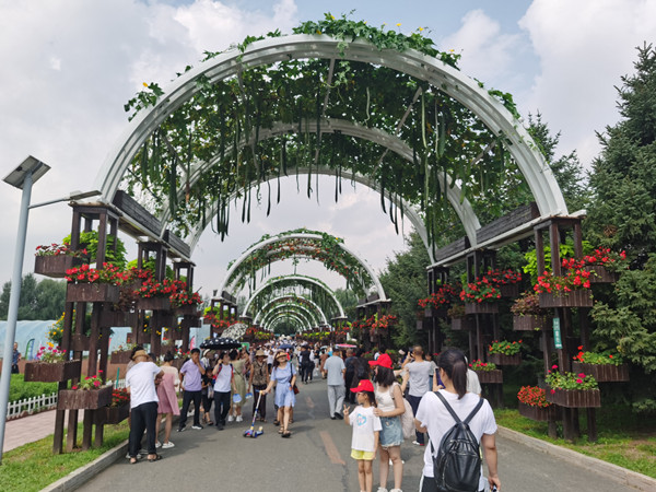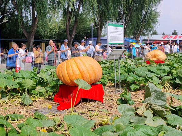 The crop exhibition area has patches of corn, sorghum, rice, sunflowers, millet, miscellaneous grains, and beans, showcasing abundant food crops. Rows of melons, baby pumpkins, peppers, eggplants, and other vegetable varieties are also on display, highlighting the bountiful harvest and economic benefits of suitable and high-nutrition crops for the northern region.