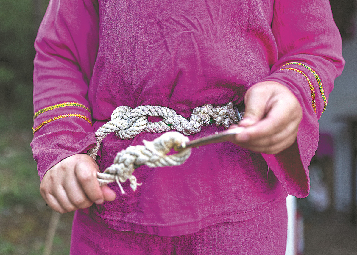 Lei Xiaoying checks the safety rope tied on her waist before staging a performance. [Photo by Zhang Youqiong/Wang Juntao/Chen Kaijin/Ye Qihan/For China Daily]
