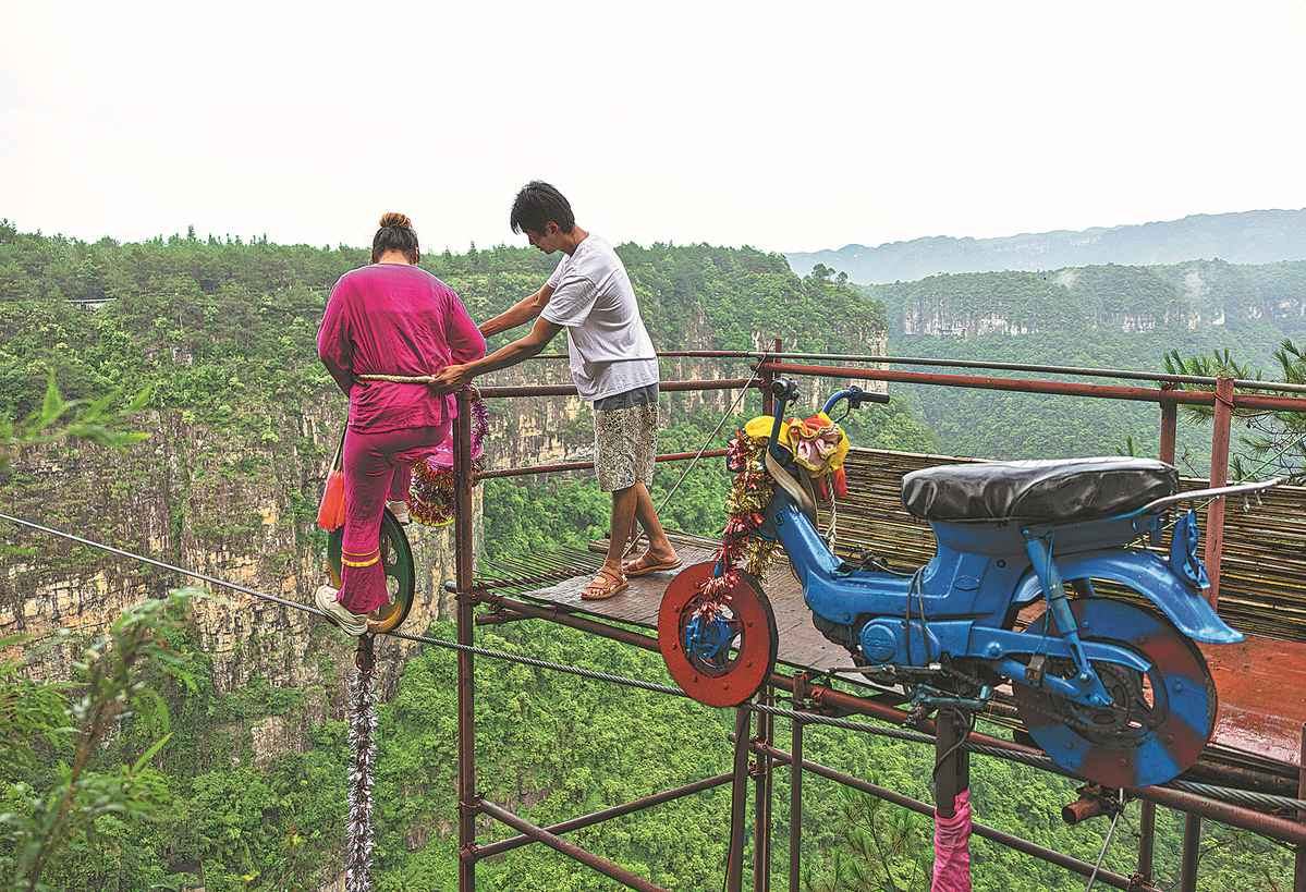 Li Guanghui helps Lei, his wife, check her equipment before she heads across the wire. [Photo by Zhang Youqiong/Wang Juntao/Chen Kaijin/Ye Qihan/For China Daily]