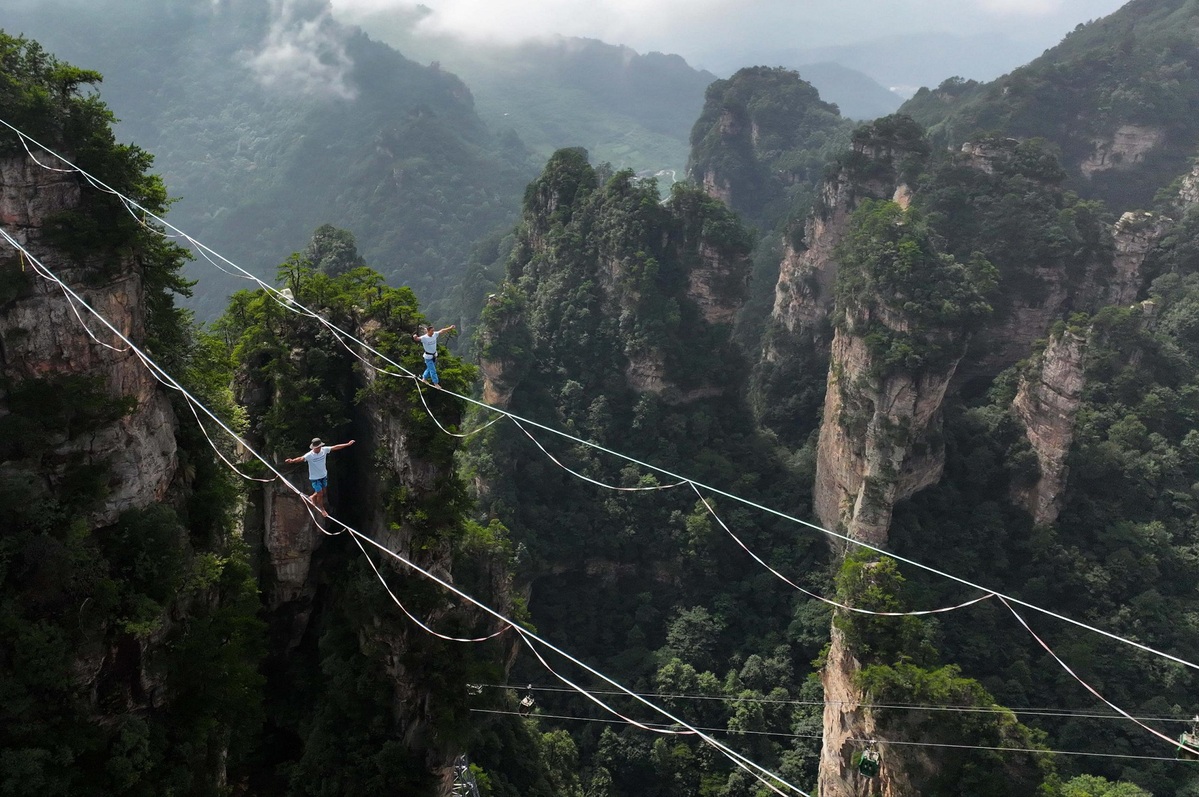 Twelve contestants from home and abroad participated in a tightrope-walking competition on Monday and Tuesday in Zhangjiajie National Forest Park in Hunan province. They had to walk 120 meters between two hills on a 2.5-centimeter rope. [Photo by Wu Yongbing/For chinadaily.com.cn]