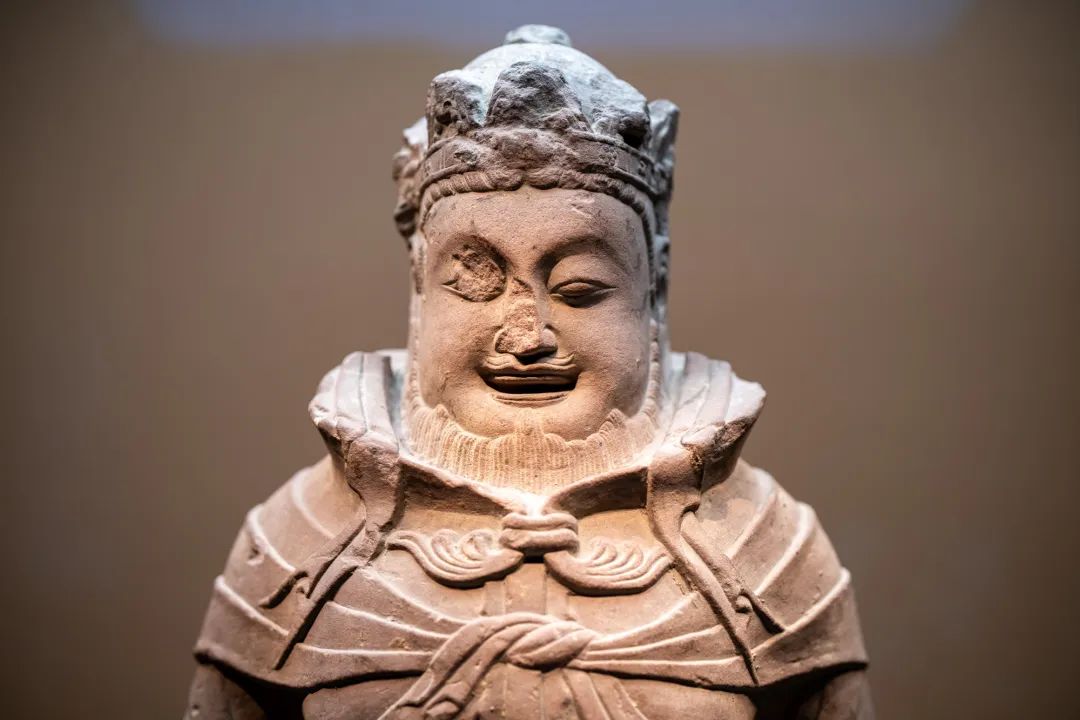 Close-up of the kind but dignified expression of the stone statue of a Heavenly King [Photo/Official WeChat account of the National Museum of China]
