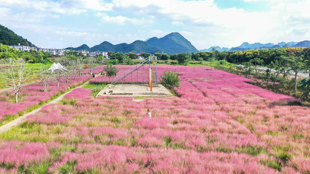 A field in Wanfenglin Street in Xingyi, Guizhou province is now adorned with blooms of the pink muhly grass, creating a mesmerizing "pink flower sea". Visitors come to this natural wonder to marvel at its beauty.