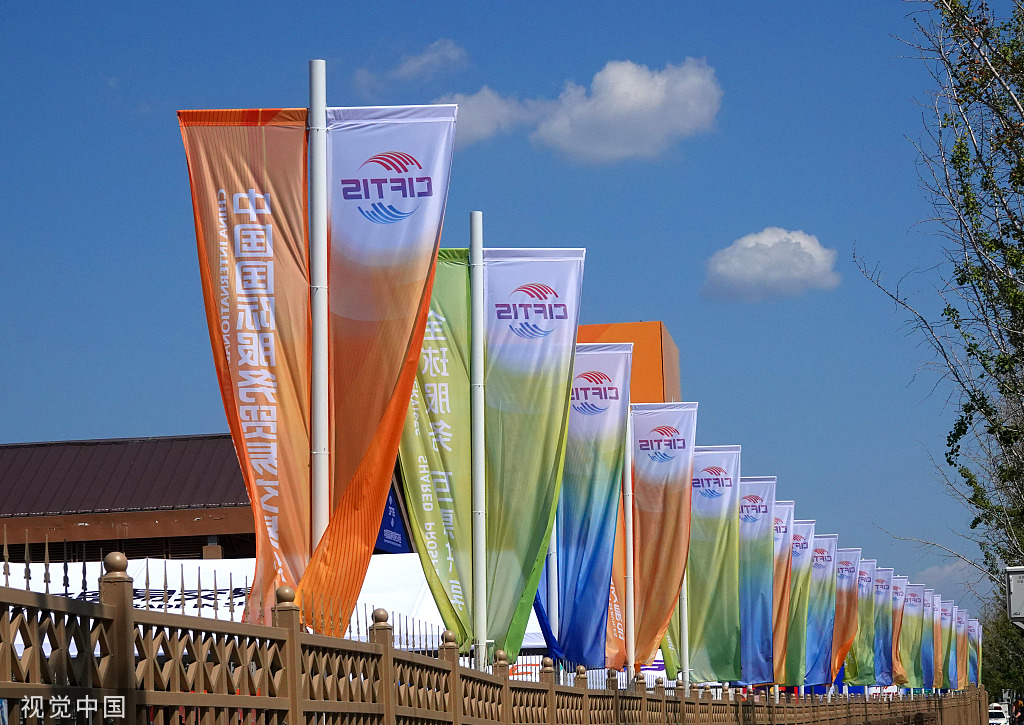 Flags flutter outside the Shougang Park venue in Beijing, Aug 28, 2023. [Photo/VCG]