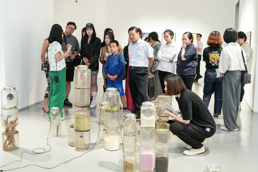For the triennial, she created Polyglot: Mulberry, an installation consisting of 30-odd glass jars of Chinese medicine in which various parts of the mulberry—fruits, leaves, branches, roots and hosts, are stored. Like how she animated many of her previous artworks (for example, making sea shells move and breathe in the 2020 installation Sea Ear Hi-hat), she connected the dried or ground mulberry parts with small electrical devices so that they could move and make sounds similar to those of wind bells as if they are keen to strike up a conversation with any viewer nearby.