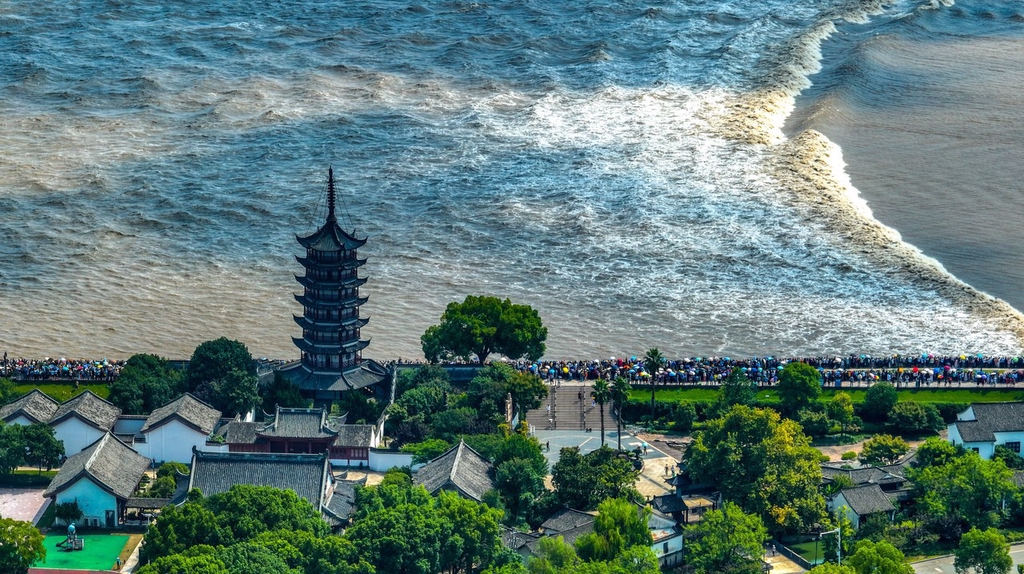 It is the perfect time to witness the awe-inspiring "Ghost King Tide" at the Yanguan scenic area on the Qiantang River in Zhejiang province. Many tourists come to watch this marvel of nature.
